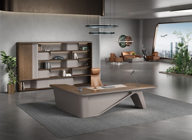 1、貼面材料:采用進口天然直紋胡桃木皮,厚度0.6mm;對紋、對色加工 2、封邊用材:與貼面相同的木皮封邊; 3、基材:采用“上思華林”E0級高密度板; 4、油漆:面漆采用“華潤”PU聚脂漆; 5、五金配件:博格維斯品牌緩沖導軌、NOVEI緩沖門鉸;臺面配黑拉絲走線盒。桌面帶智能升降線盒,附柜帶指紋鎖