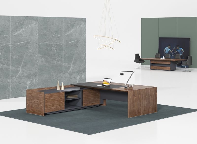 1、貼面材料:采用進(jìn)口天然小山紋胡桃木皮,厚度0.6mm;對紋、對色加工 2、封邊用材:與貼面相同的木皮封邊; 3、基材:采用“上思華林”E0級高密度板; 4、油漆:面漆采用“華潤”PU聚脂漆; 5、五金配件:博格維斯品牌緩沖導(dǎo)軌、NOVEI緩沖門鉸;臺面配黑拉絲走線線盒,內(nèi)含多功能線蓋板;班臺臺腳鋁拉絲裝飾; 6、特殊工藝:全系采用大斜邊和45度拉米諾連接工藝;